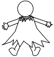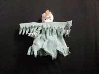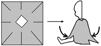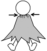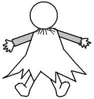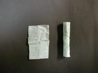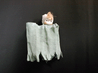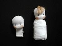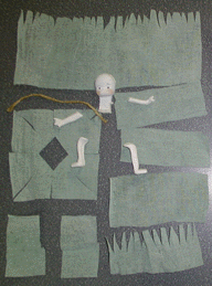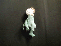 - 胴布を頭からかぶせ首と胴体にボンドで留め、逆さにして、股・足の付け根からティッシュが見えないように包む。